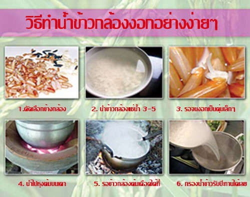 1. นำข้าวกล้องขาวดอกมะลิ 105 หรือปทุมธานี 1 มาเพาะให้งอกเป็นตุ่มเล็กๆ โดยนำข้าวกล้อง มาล้างน้ำทำความสะอาด แล้วแช่น้ำนาน 4 ชั่วโมง จากนั้นทำการล้างข้าว ทิ้งให้สะเด็ดน้ำ ใส่ในภาชนะ ปิดทิ้งไว้นาน 6 ชั่วโมง เมื่อครบเวลา ล้างข้าวอีกครั้ง ทิ้งให้สะเด็ดน้ำ ใส่ในภาชนะปิด ทิ้งไว้นาน 14 ชั่วโมง เมื่อครบเวลาจะได้เมล็ดข้าวกล้องงอกสด