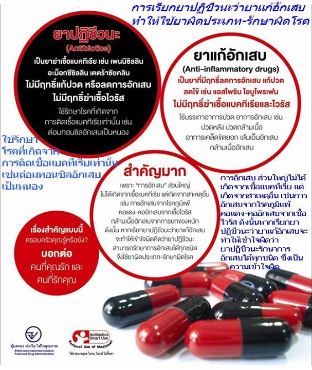 2. เกิดทัศนคติและความเข้าใจผิดๆว่า ยาฆ่าเชื้อและยาแก้อักเสบมันคืออันเดียวกัน ซึ่งปัญหานี้เกิดมานานแล้ว และยังคงมีความเข้าใจผิดกันอยู่อีกหลายท้องถิ่น สุดท้ายแล้วผู้ป่วยบางรายที่ไม่อยากมาพบคุณหมอที่โรงพยาบาลก็จะใช้ยารักษาเองแบบผิดๆ เพราะสลับกันระหว่างยาฆ่าเชื้อและยาแก้อักเสบ