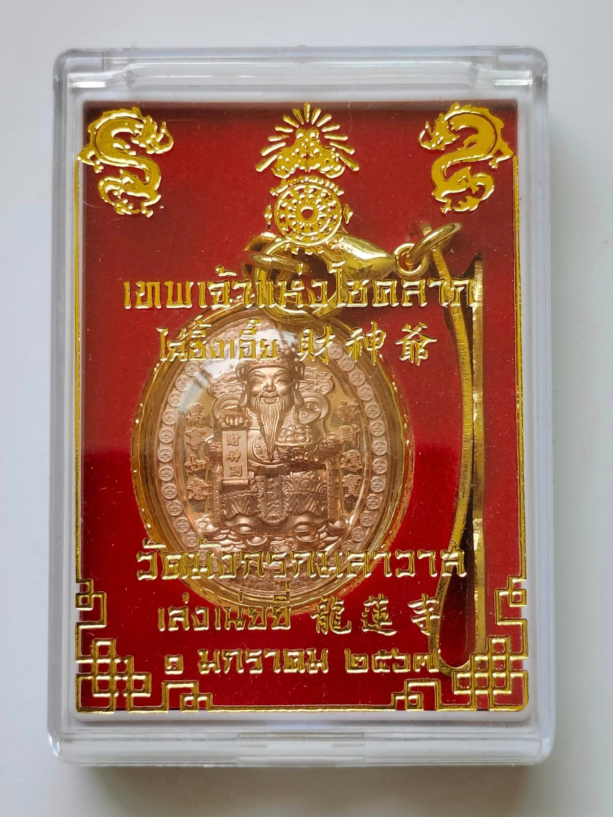 เหรียญ เทพเจ้าแห่งโชคลาภ ไฉ่ซิ้งเอี๊ย เนื้อทองแดงกะหลั่ยนาค วัดมังกรกมลาวาส เล่งเน่ยยี่ 1 มกราคม 2567 อุดมโภคทรัพย์ มั่งมีศรีสุข เลี่ยมเดิมวัด พร้อมแนบมังกรหนุนดวง