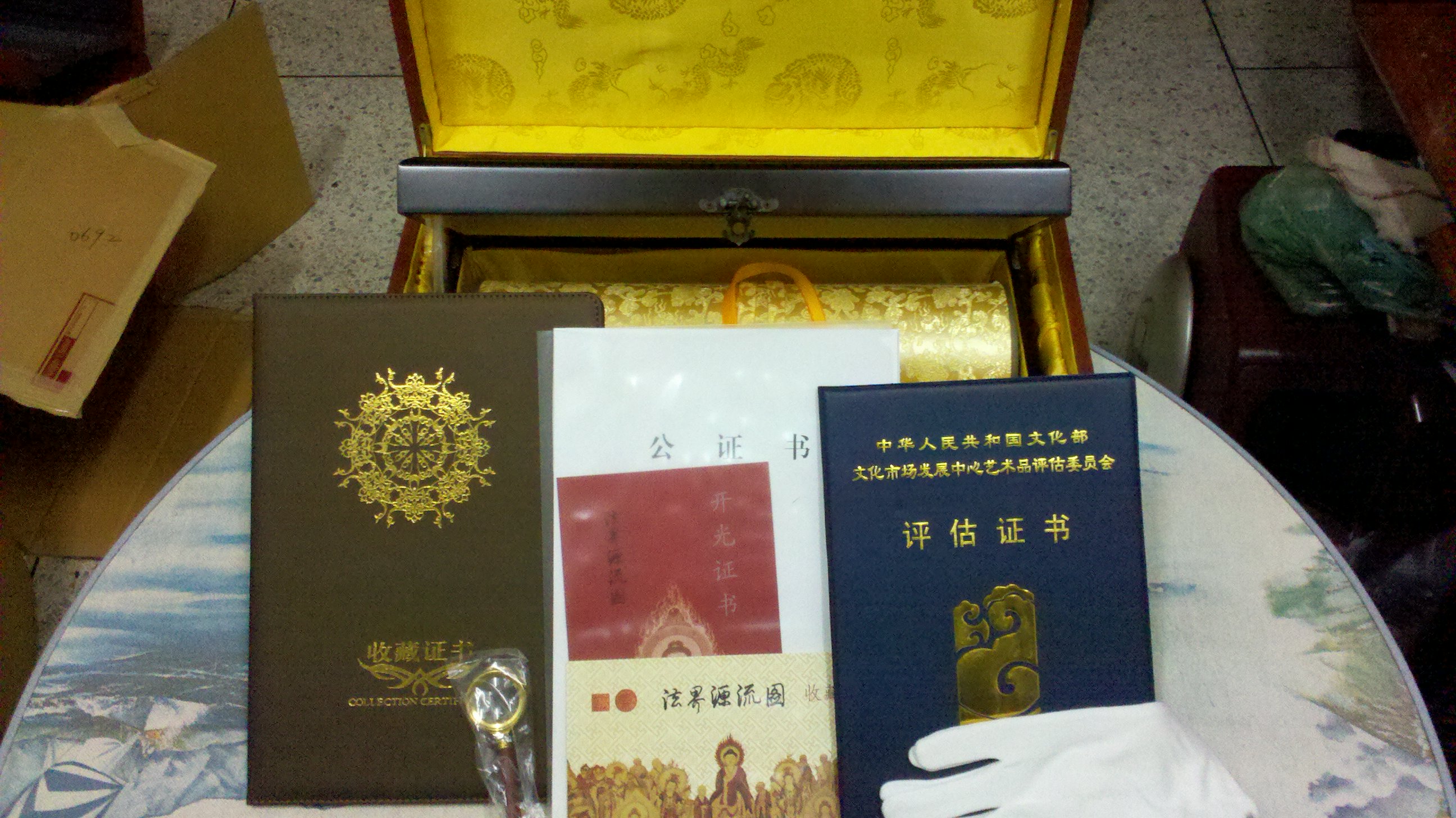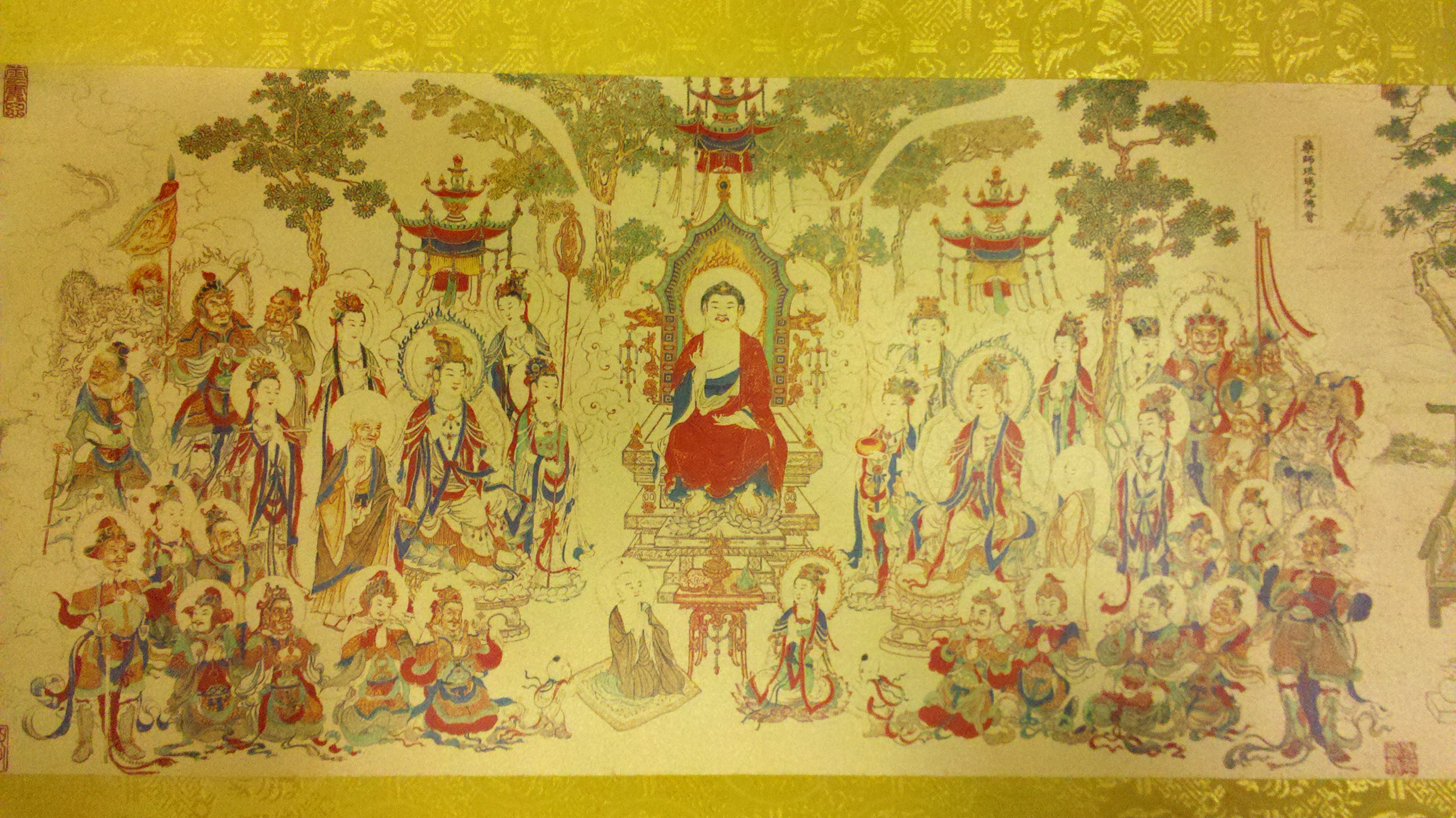 รูปภาพศิลป์โบราณเสริมวาสนาบารมีรูปพระพุทธหนึ่งพันองค์วาดลายทองบนผ้าไหมจีน